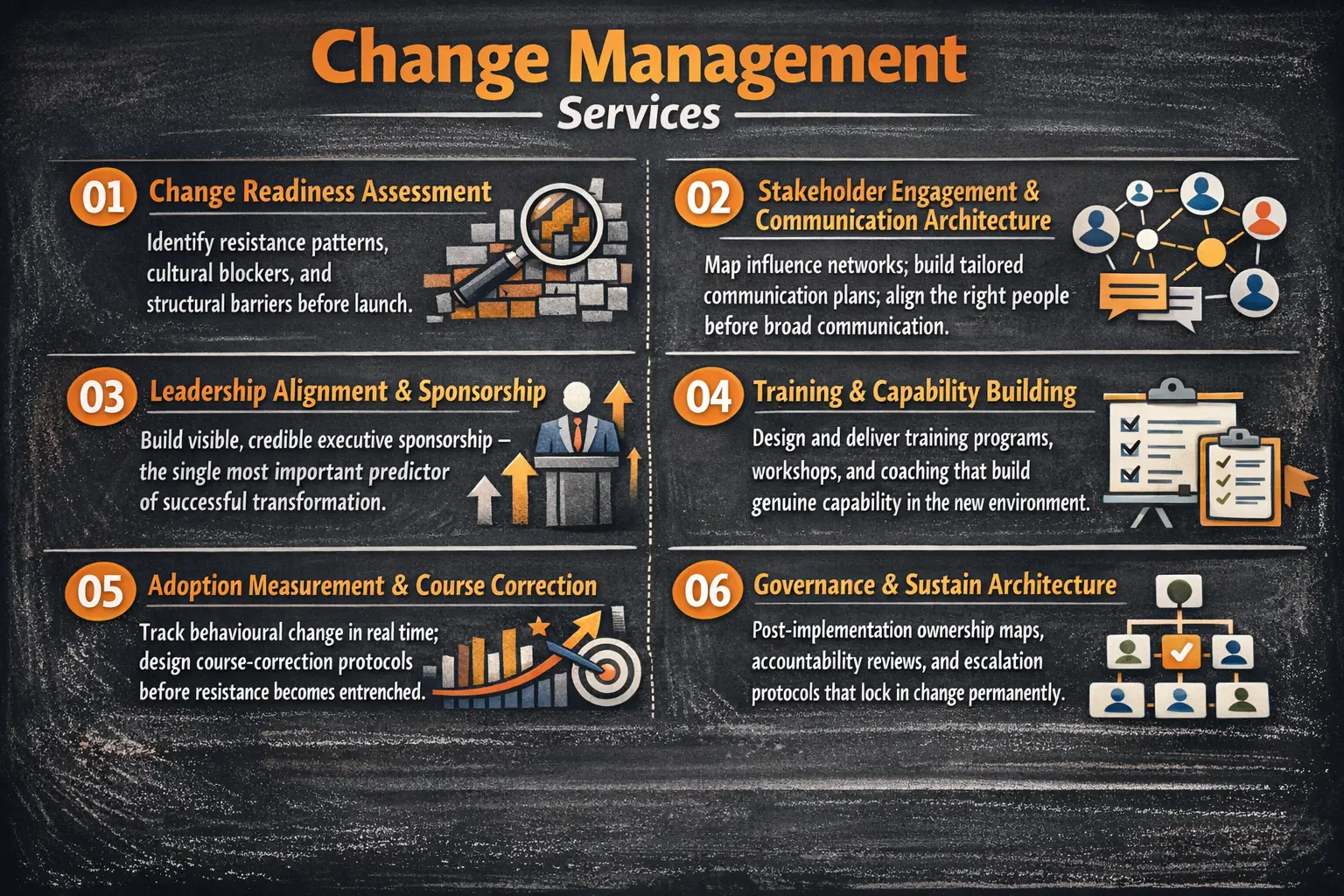 Magnum One’s Change Management practice is built around making transformation stick — by designing the governance, incentive, and accountability structures that make the new way the only viable way.
